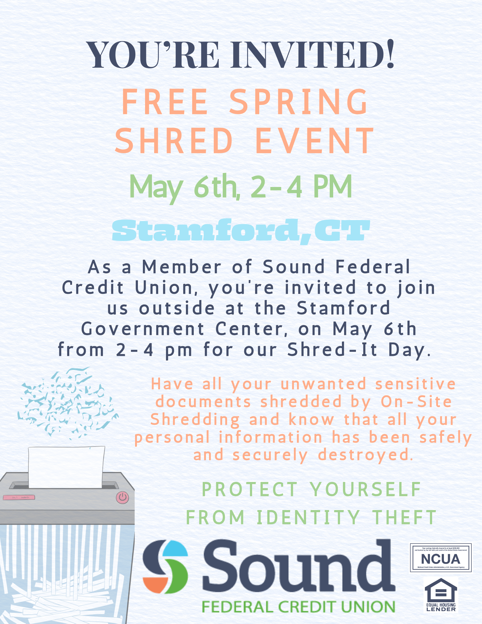 Join us on May 6th for our free Spring Shred-It Event! We will be located outside at the Stamford Government Center from 2-4 PM. Have all your unwanted sensitive documents shredded by On-Site Shredding and know that all your information has been safely and securely destroyed.