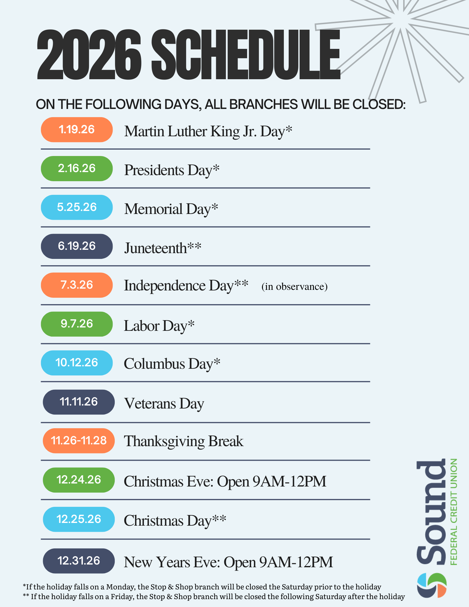 - Superior Service – At Sound Federal Credit Union, we are committed to providing you with the highest level of personalized member service. Our knowledgeable staff will work with you to help you achieve your financial goals.